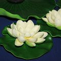 7" round Solar battery powered lily with three pads of white light. looks great and adds a new dimensiuon to a pond at night time. Recharges during the day.